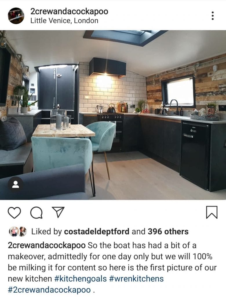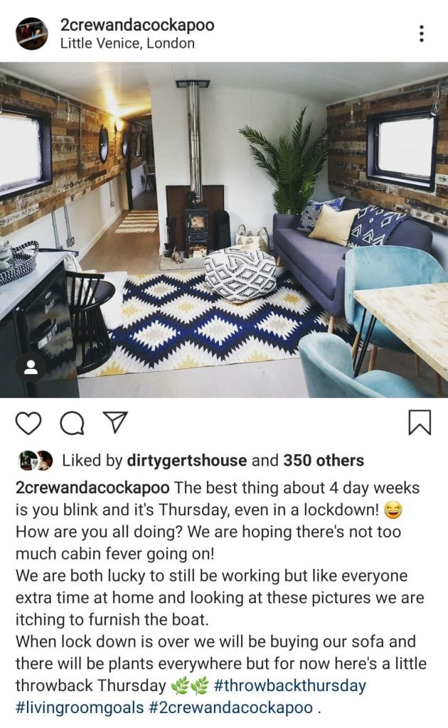 Gaby paints a similarly pretty picture of life on board: “Right now, we’ve got the swan hatch open, which faces onto the canal, and the water is just dancing on the ceiling and the sun is streaming in and it’s lovely.”