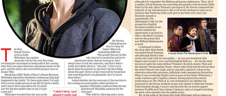 This article was written for The Telegraph, India, and can be viewed online here When BBC’s Newsnight revealed that Jodie Whittaker would be replacing Peter Capaldi as the thirteenth Doctor in the popular sci-fi series, Doctor Who, reactions were a mixed bag to say the least. The casting announcement was divisive because in the shows 54-year … Continue reading It’s time to travel forward in time, not backwards: a female Doctor can only be a good thing